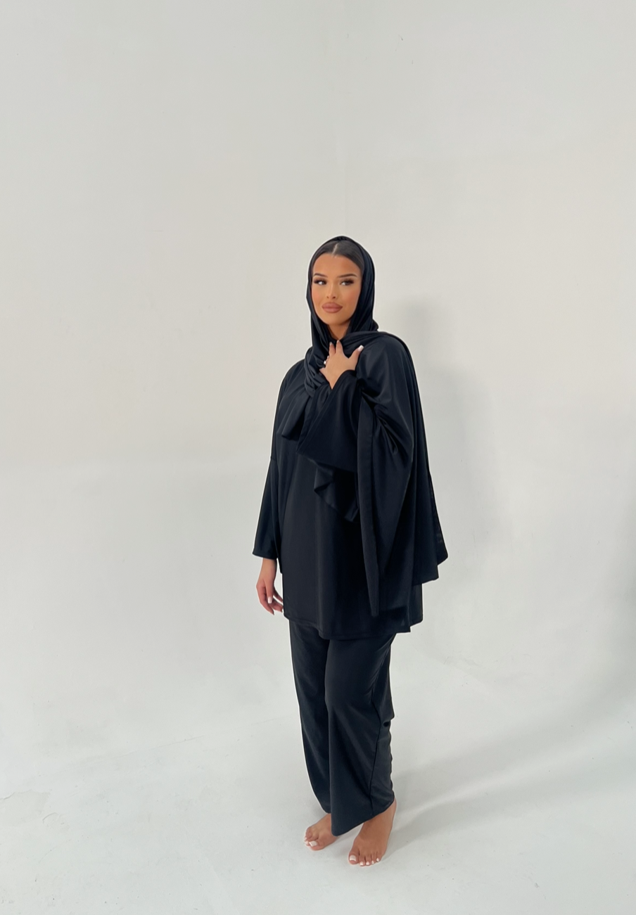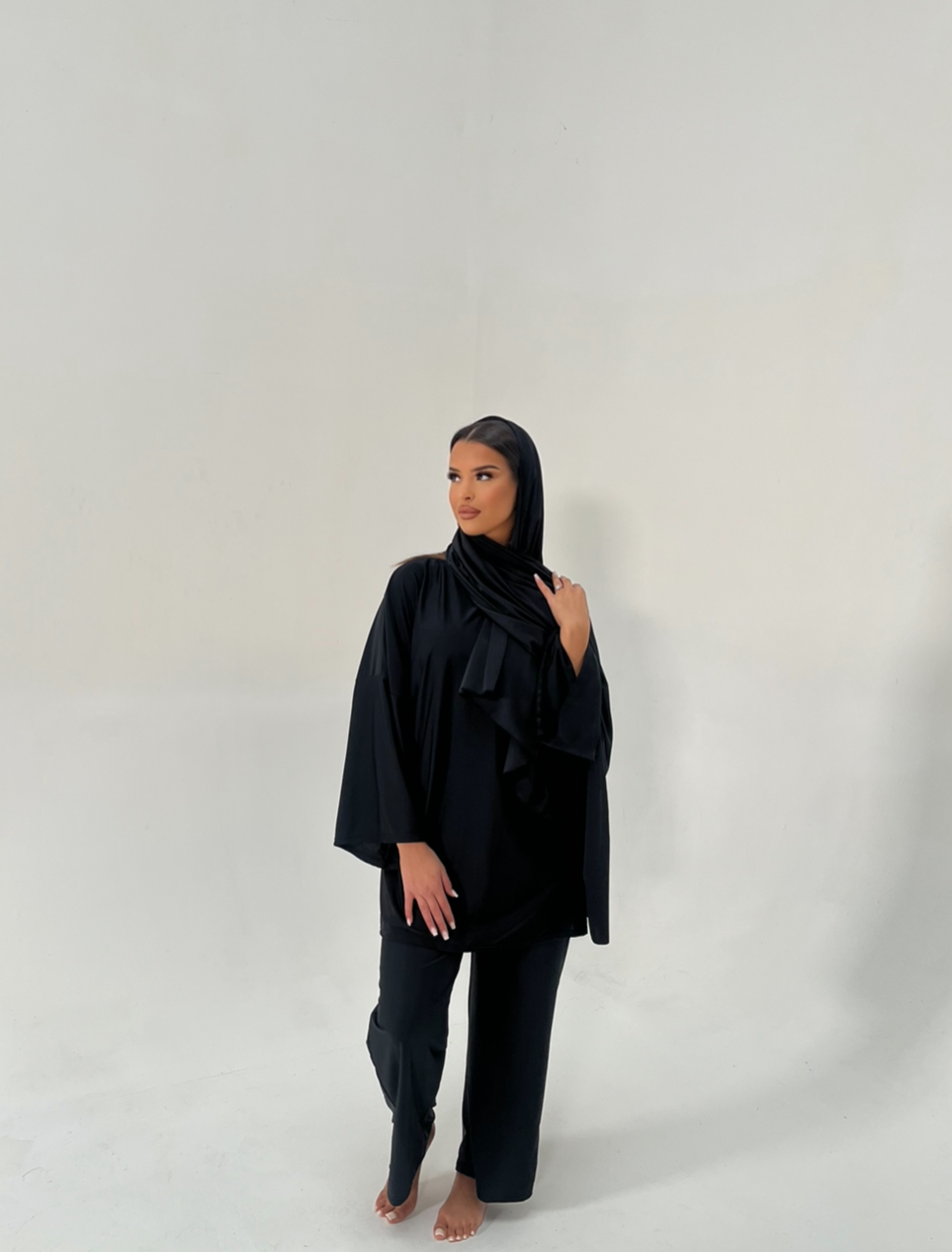 Ce burkini trois pièces inclut un haut, un pantalon et un voile léger d’environ 1m70. Sa coupe sobre et élégante convient à toutes celles qui recherchent confort et simplicité sans compromis sur le style.