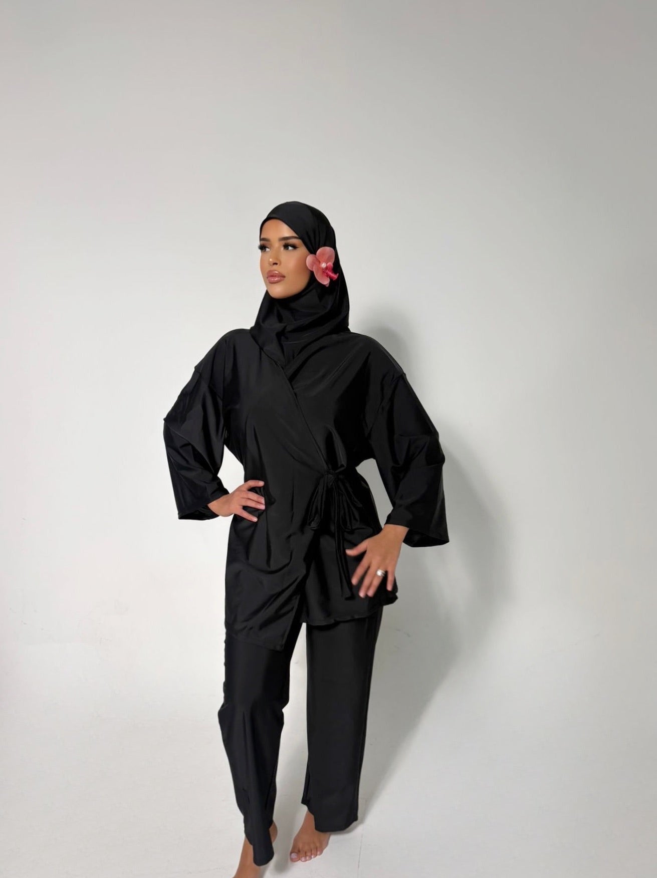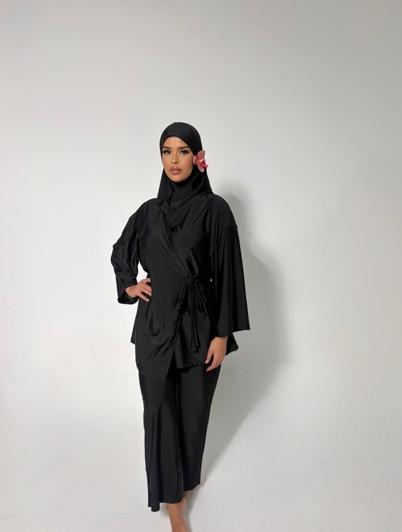 Ce burkini trois pièces inclut un haut, un pantalon et un turban léger. Sa coupe sobre et élégante convient à toutes celles qui recherchent confort et simplicité sans compromis sur le style.
