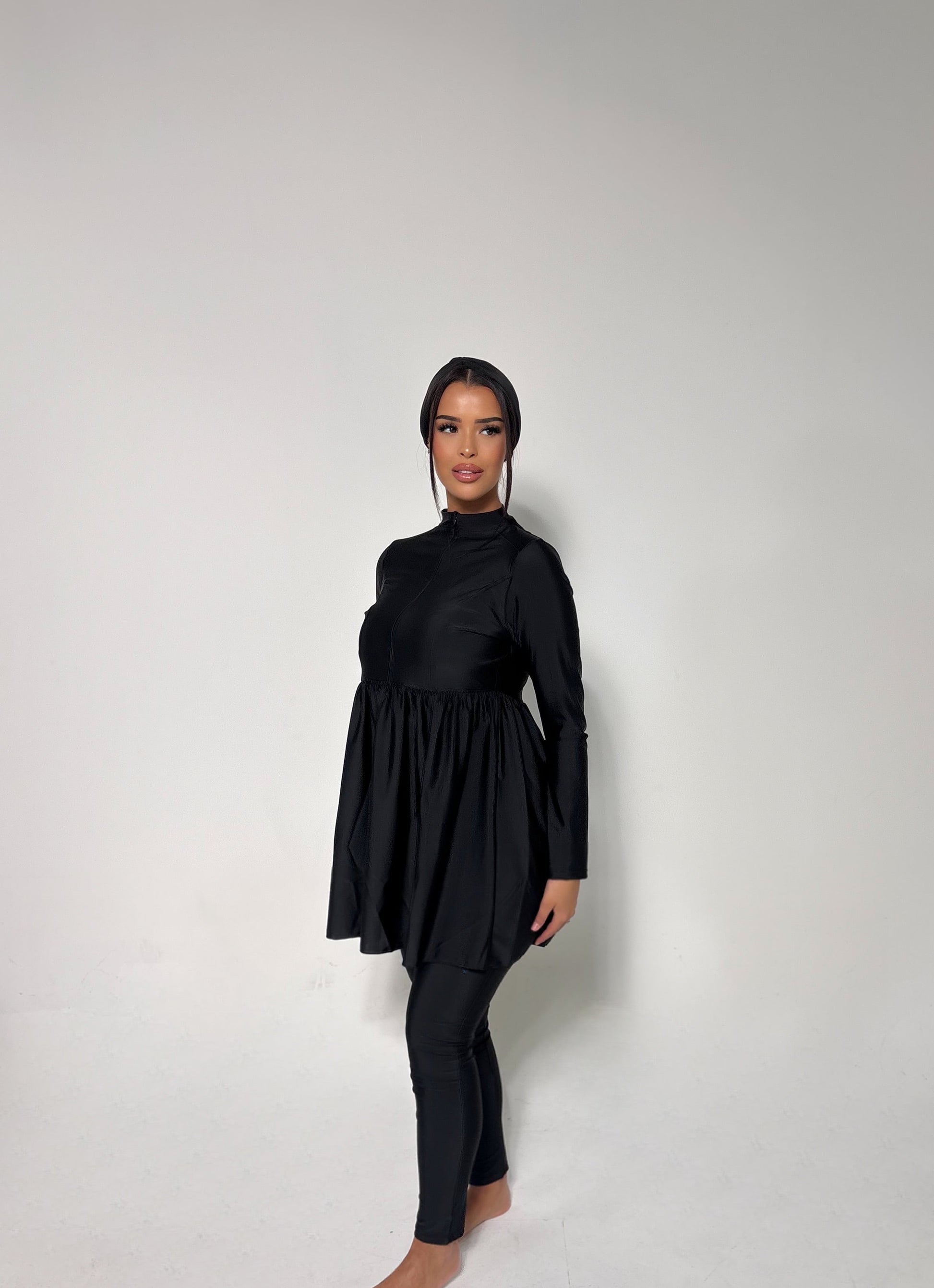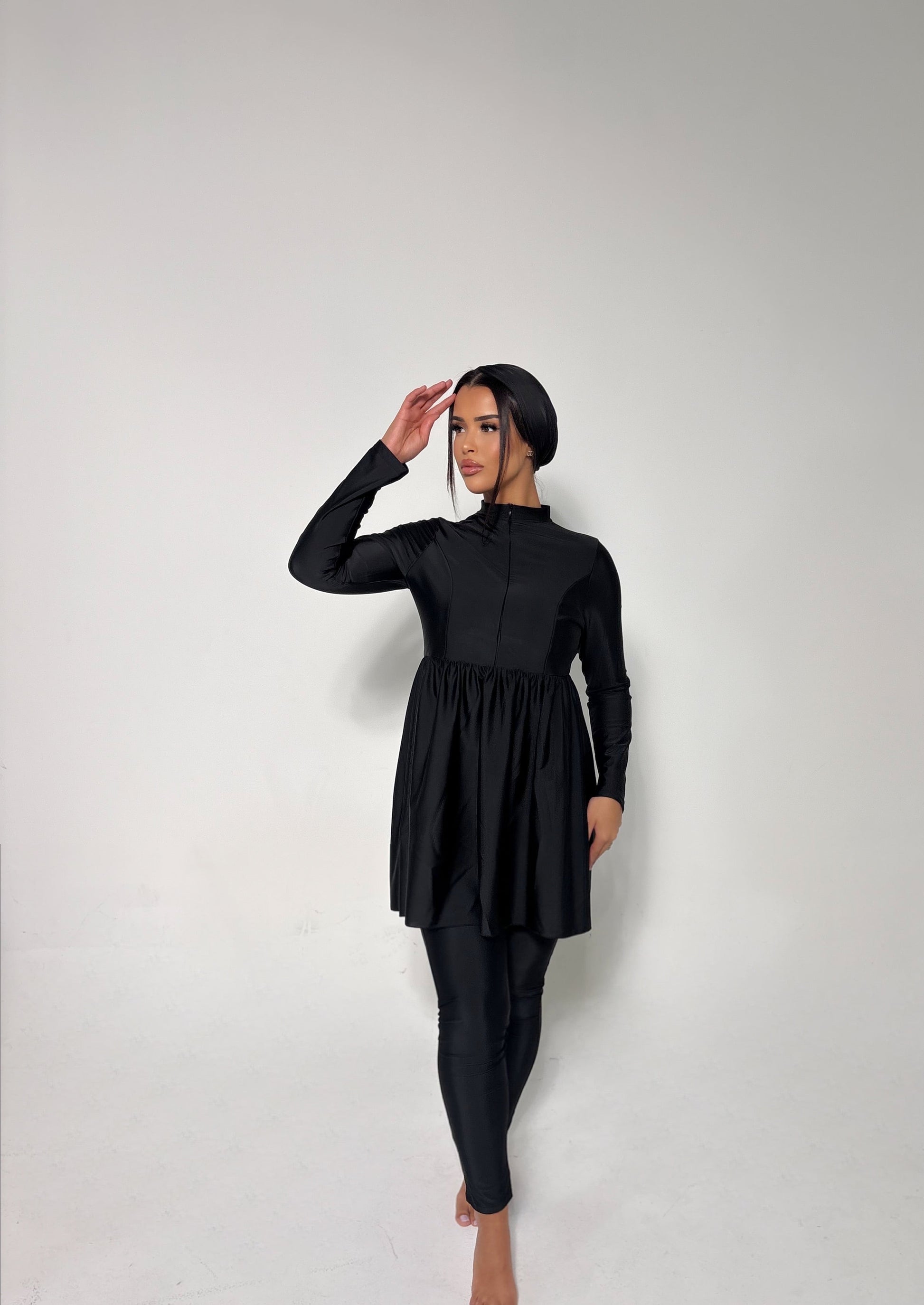 Ce burkini trois pièces inclut un haut, un pantalon et un turban léger. Sa coupe sobre et élégante convient à toutes celles qui recherchent confort et simplicité sans compromis sur le style.