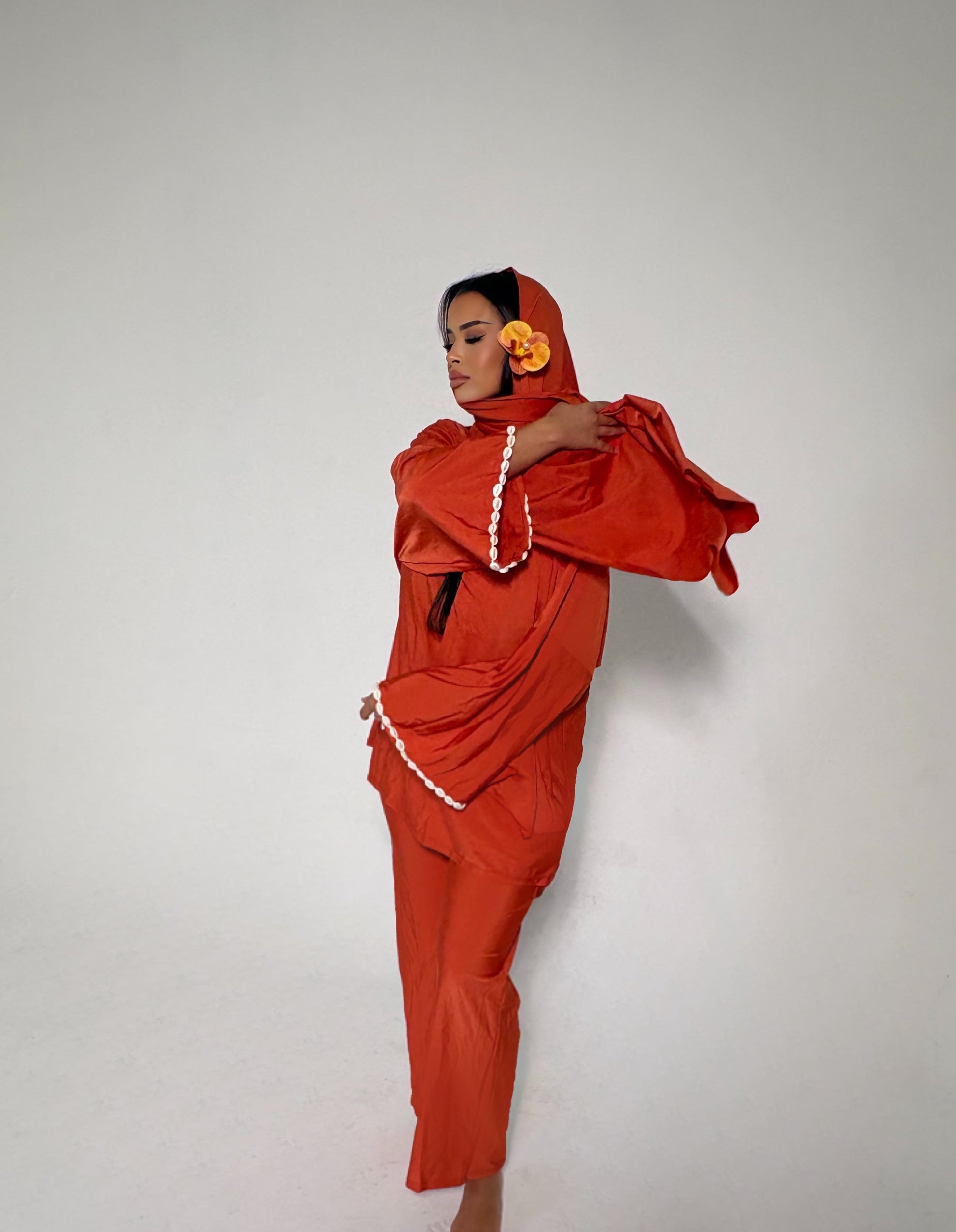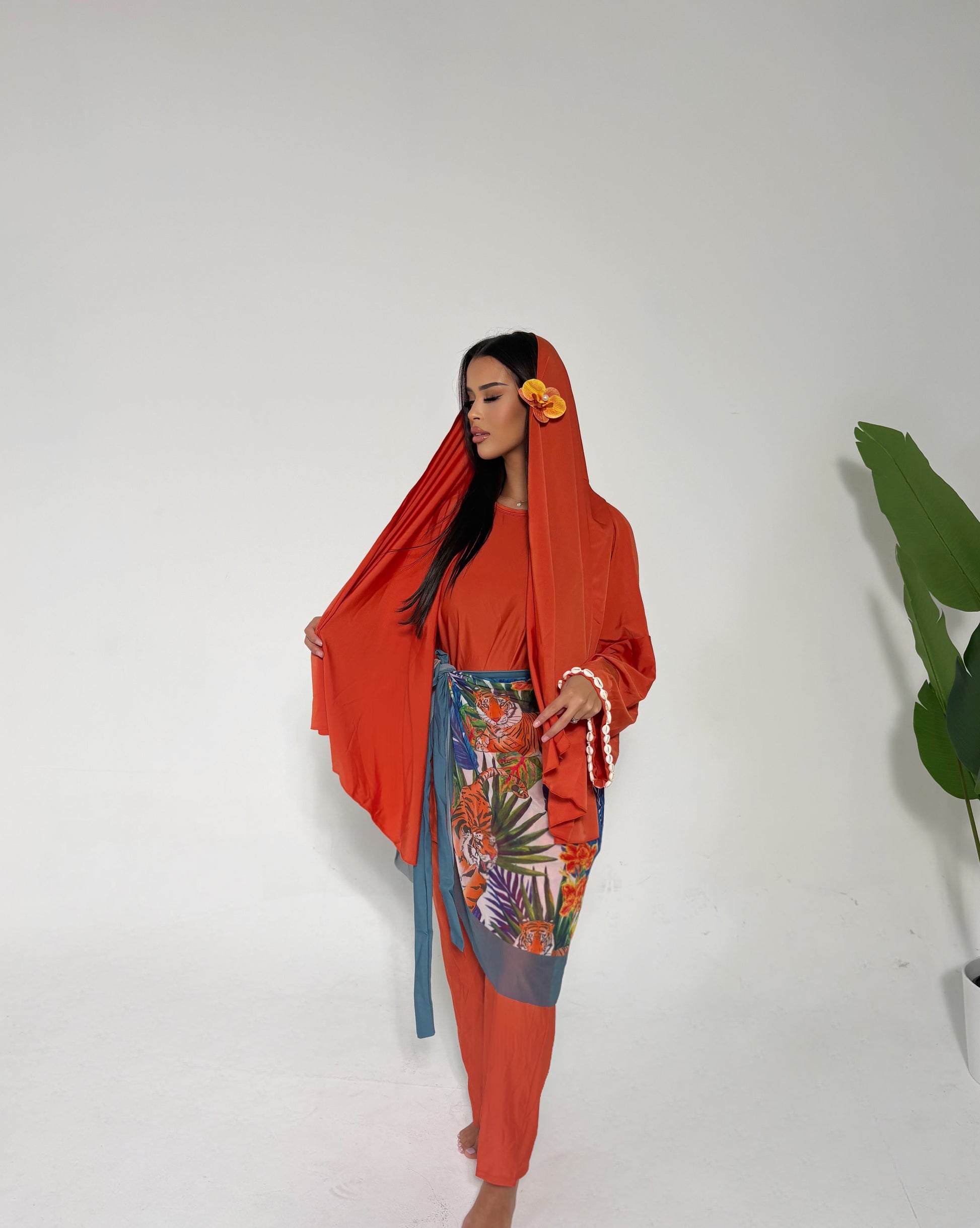 Ce burkini trois pièces inclut un haut, un pantalon et un voile léger d’environ 1m70. Sa coupe sobre et élégante convient à toutes celles qui recherchent confort et simplicité sans compromis sur le style.